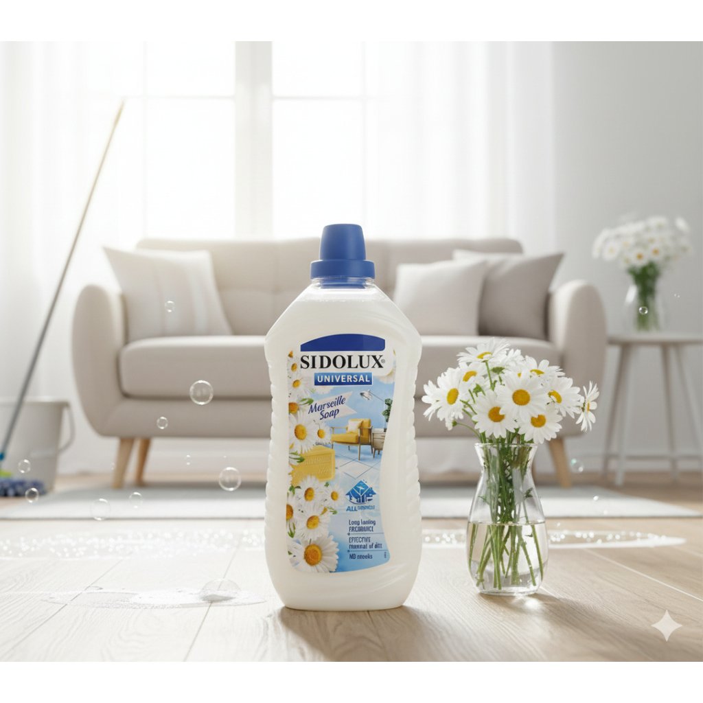 SIDOLUX na podlahu. Připravte se na nový zážitek při úklidu s naším SIDOLUX universal Marseillské mýdlo. Tento univerzální čistící prostředek na podlahu je vyroben tak, aby vám nabídl nejen čistotu a lesk, ale také vás odměnil svěží a příjemnou vůní marseilského mýdla.