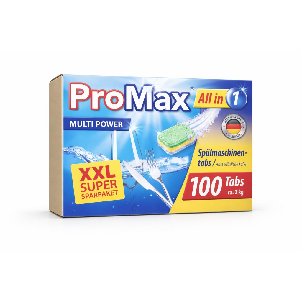 Tablety do myčky Premium ProMax Multi Power 12v1 s rozpustnou fólií 100 ks představují spojení vysoké účinnosti, úsporného balení a ověřené německé kvality. Jsou ideální volbou pro každodenní mytí nádobí v automatických myčkách, a to jak v domácnostech, tak i v profesionálních provozech (gastro, kanceláře, hotely).Díky modernímu složení 12v1 a výrobě podle přísných standardů, které jsou typické právě pro německou kvalitu, poskytují tyto tablety do myčky stabilní a spolehlivý výkon při každém mycím cyklu.Tablety do myčky Premium ProMax Multi Power 12v1 slouží k pravidelnému i intenzivnímu mytí nádobí v automatických myčkách nádobí. Jsou určeny pro uživatele, kteří požadují dlouhodobě konzistentní výsledky, vysokou účinnost a zároveň důraz na německou kvalitu zpracování i složení.
